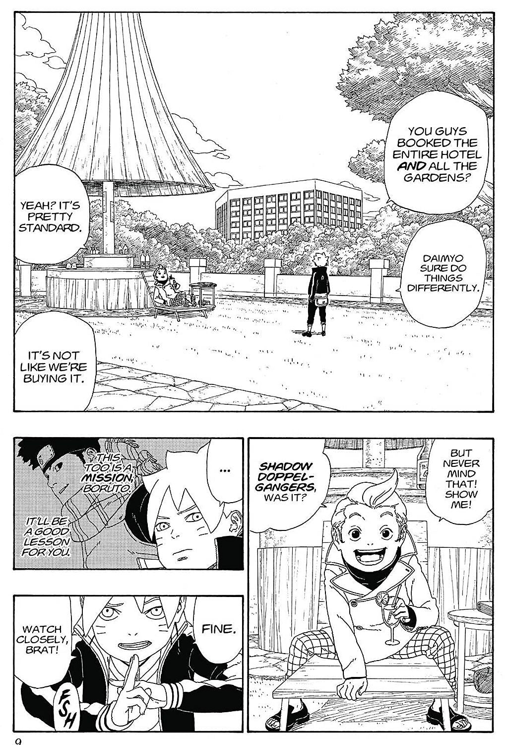 Boruto's been entrusted with the very important mission of guarding the Daimyo's son, Tento. Babysitting a spoiled brat isn't the type of work Boruto had in mind when he became a ninja. But perhaps the two boys are more alike than they seem...