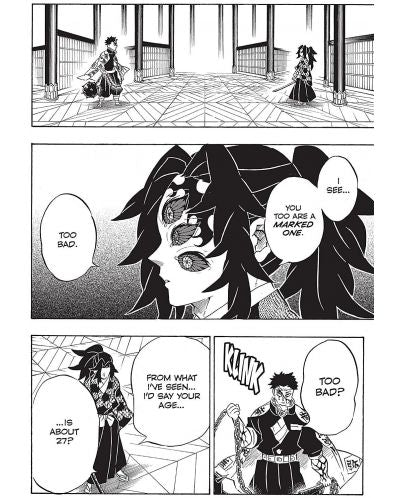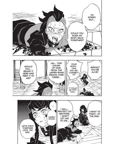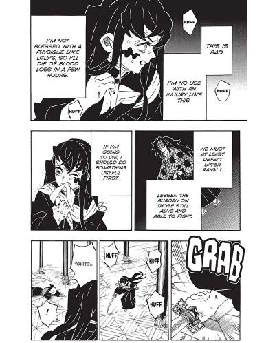 Their initial confrontation with Kokushibo, the most powerful of Muzan's demons, has left Tokito severely wounded and Genya cut in half -- but still alive! Can his regenerative power heal even this fatal wound? The Hashira Himejima and Sanemi square off with Kokushibo and unleash all the skill they have against him. Himejima is blind, but if he can see into the Transparent World he might have a chance. Who will survive this whirlwind of flashing blades?